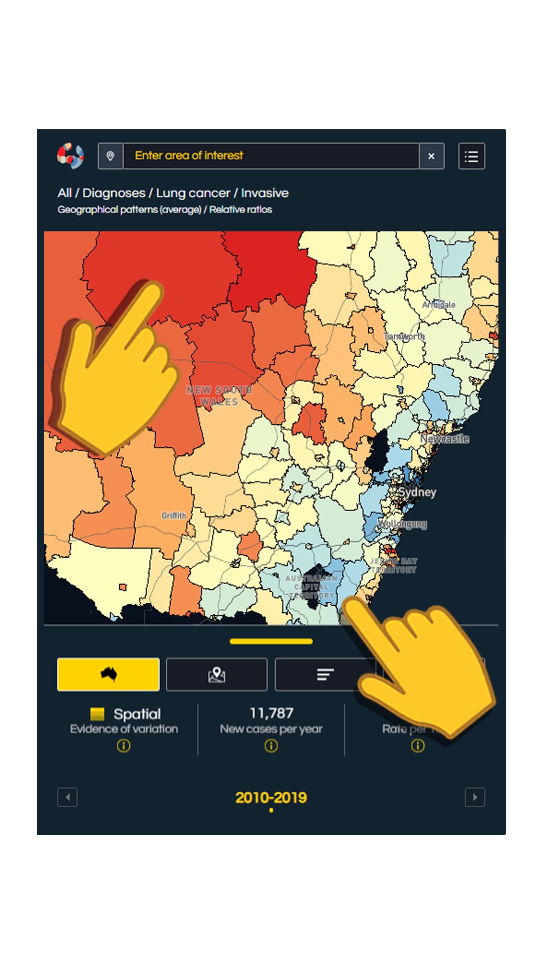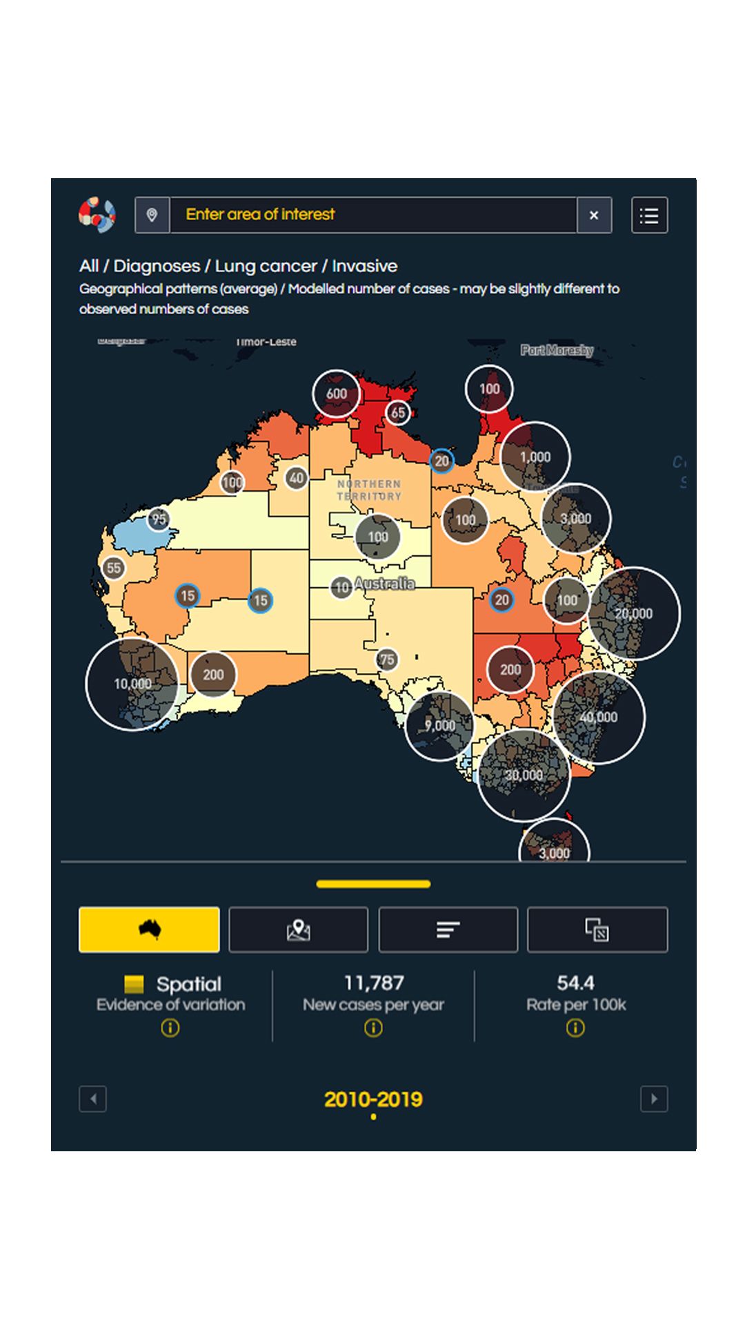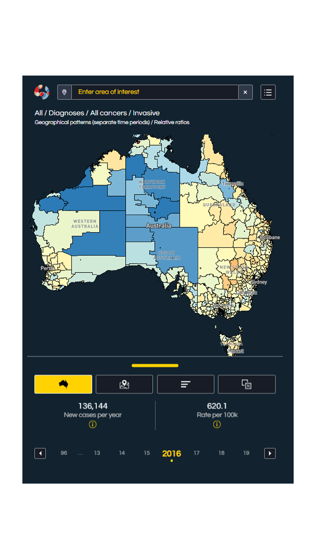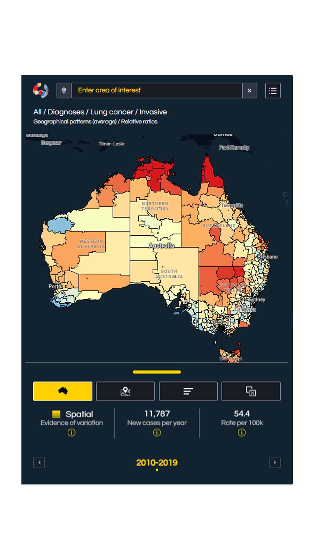 The Australian Cancer Atlas is a free, interactive tool that visually maps cancer rates across Australia. By using both spatial and temporal tracking of cancer, it allows users to see cancer patterns over time and across various regions, comparing diagnosis and survival rates and other measures over time.