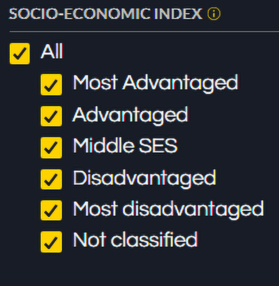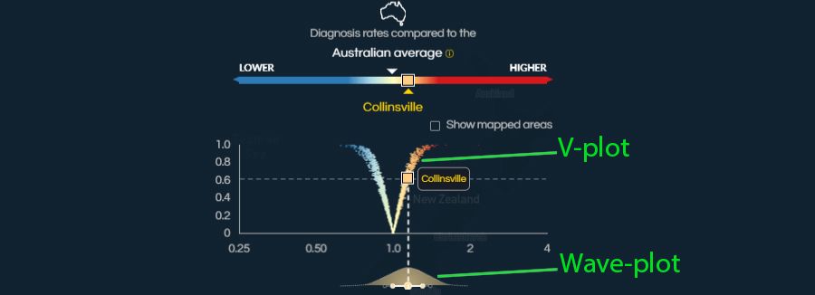 The Bayesian models also provide details about the uncertainty in these estimates, so we can understand how likely the estimate for a specific area is truly above or below the Australian average. This uncertainty is visualised in multiple ways throughout the Atlas such as the V-plot and wave-plot. As soon as an area on the map is clicked, a drawer menu pops up from the bottom of the window containing V-plot and wave plot.