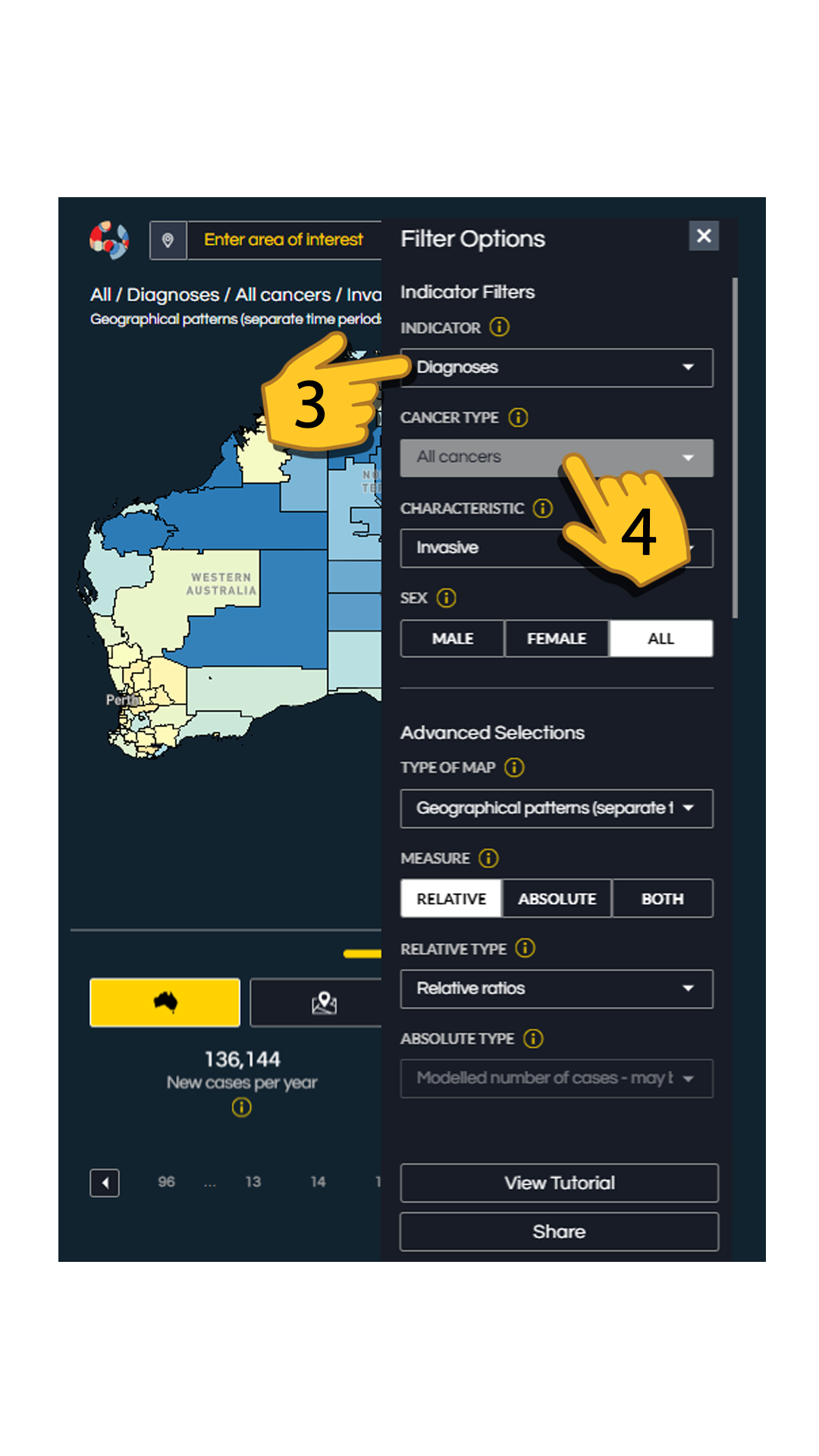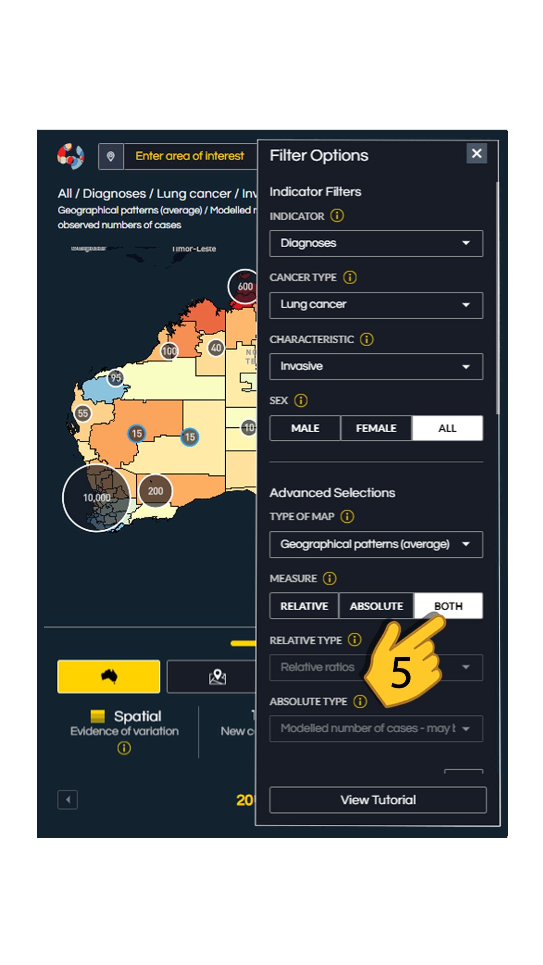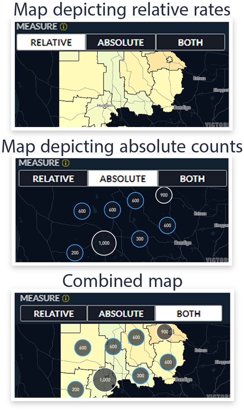 It is important to note that instead of the actual number of cancer patients, the absolute counts are presented as modelled counts (i.e. estimates generated using statistical models) in the Atlas. The modelled counts improve the reliability of the estimates and prevent any issues with confidentiality of the counts for small areas. The Atlas provides three different map views to display the measures: relative view, absolute view, and combined view.