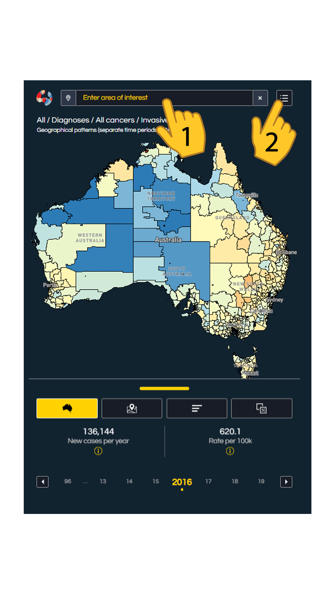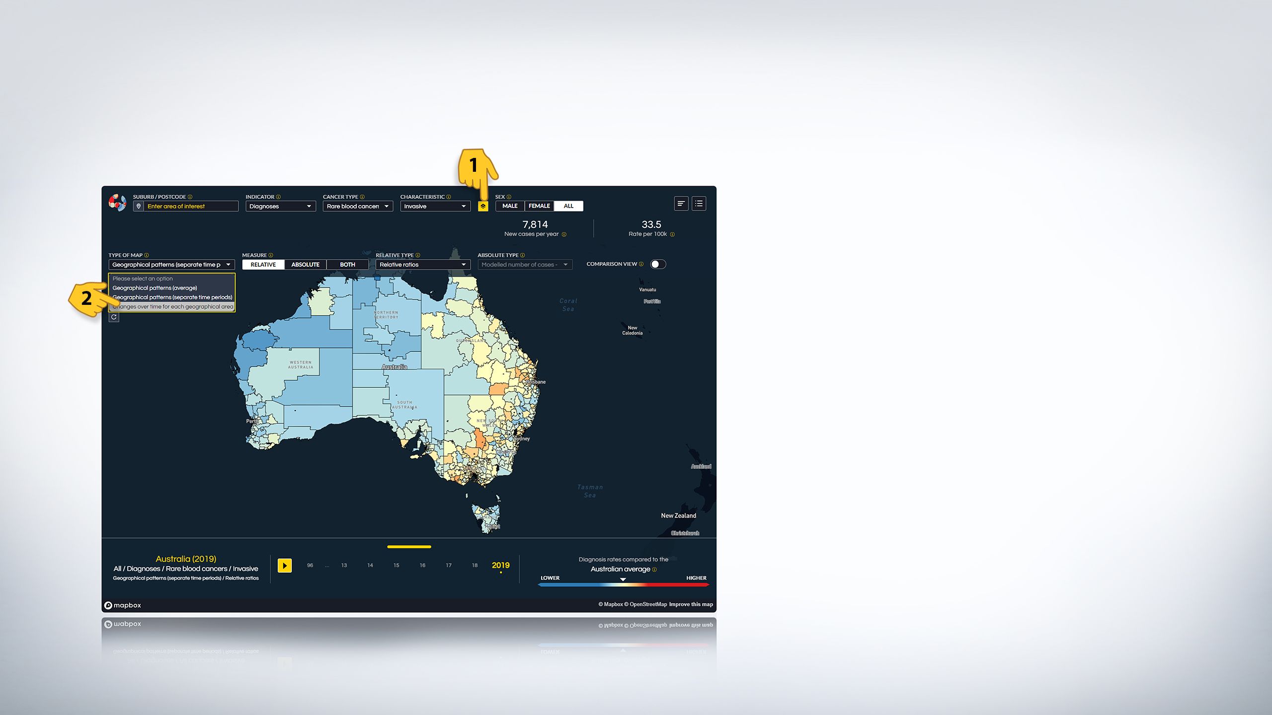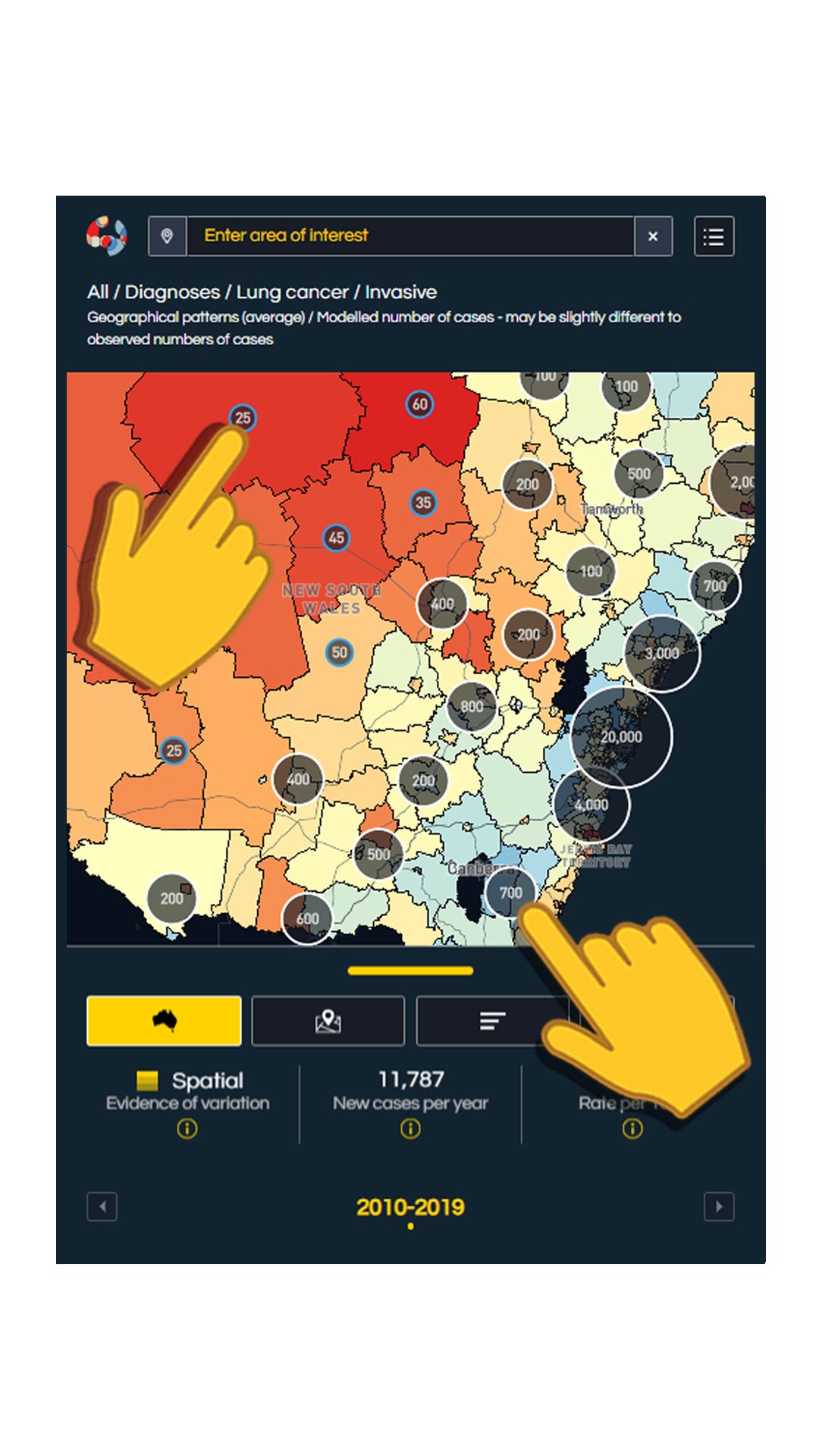 This interactive visualisation tool helps people to understand the meaning of complex statistics associated with cancer diagnosis and survival. The statistics presented in the Australian Cancer Atlas are ‘modelled estimates’. Original data provided by multiple sources are modelled using advanced statistical methods. Only a small number of people tend to be diagnosed with cancer in each geographical area, and so statistical methods are used to ‘smooth’ the numbers to reduce the impact of random fluctuation and measure the level of uncertainty in the modelled estimates.