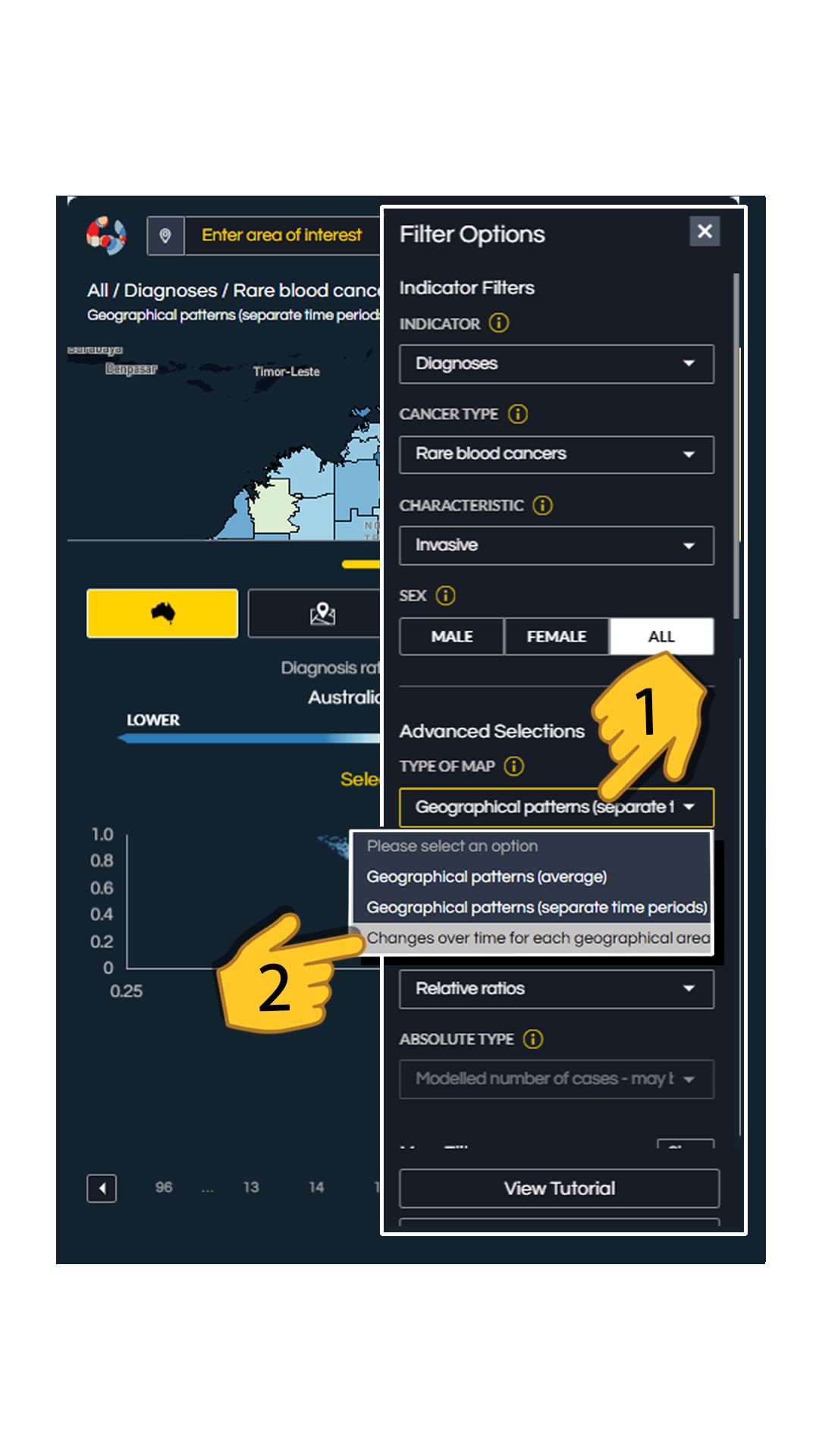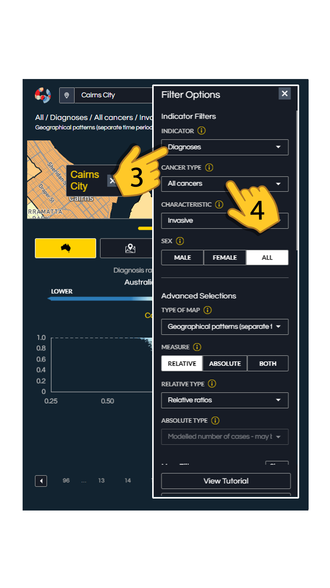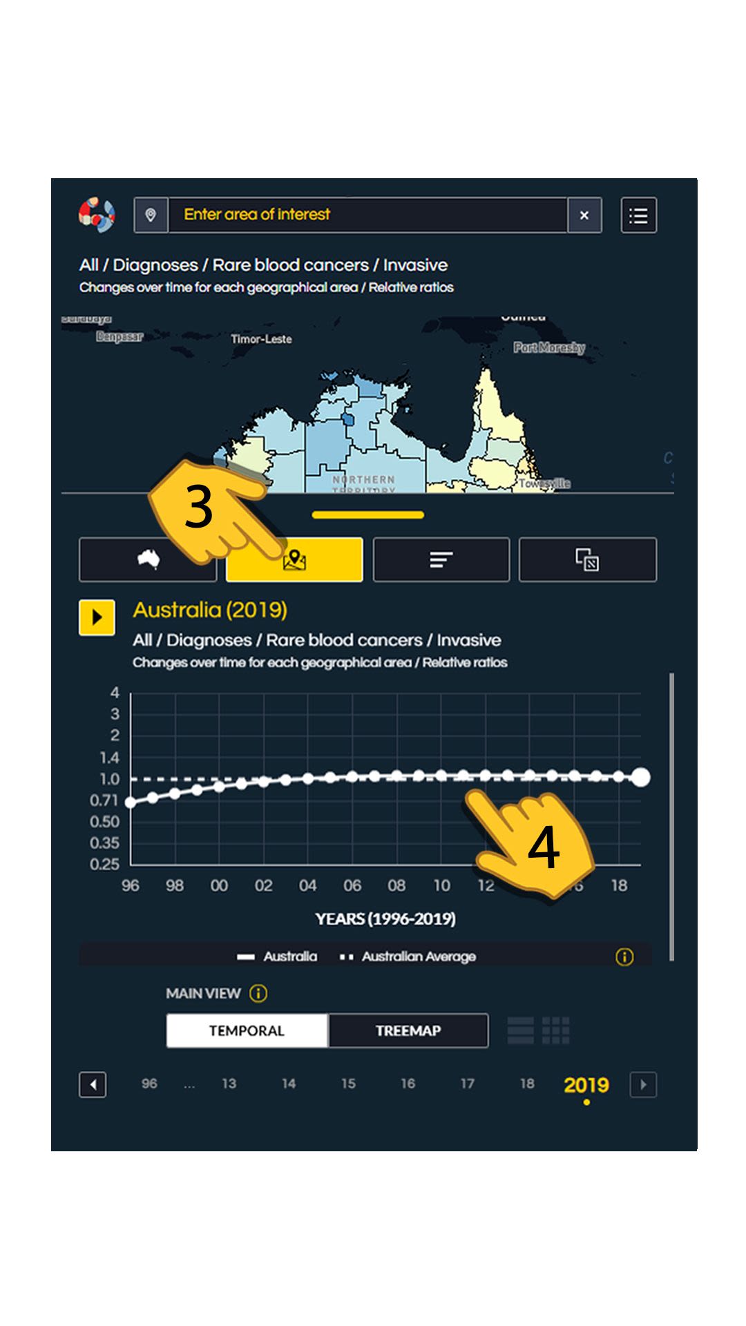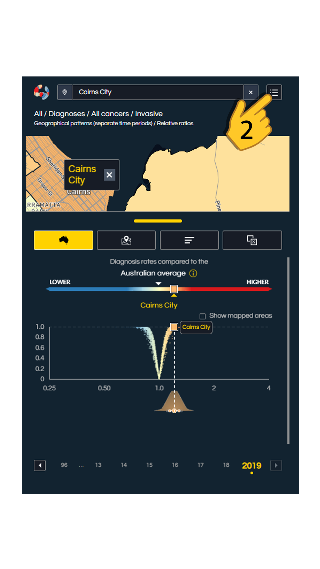 This interactive visualisation tool helps people to understand the meaning of complex statistics associated with cancer diagnosis and survival. The statistics presented in the Australian Cancer Atlas are ‘modelled estimates’. Original data provided by multiple sources are modelled using advanced statistical methods. Only a small number of people tend to be diagnosed with cancer in each geographical area, and so statistical methods are used to ‘smooth’ the numbers to reduce the impact of random fluctuation and measure the level of uncertainty in the modelled estimates.