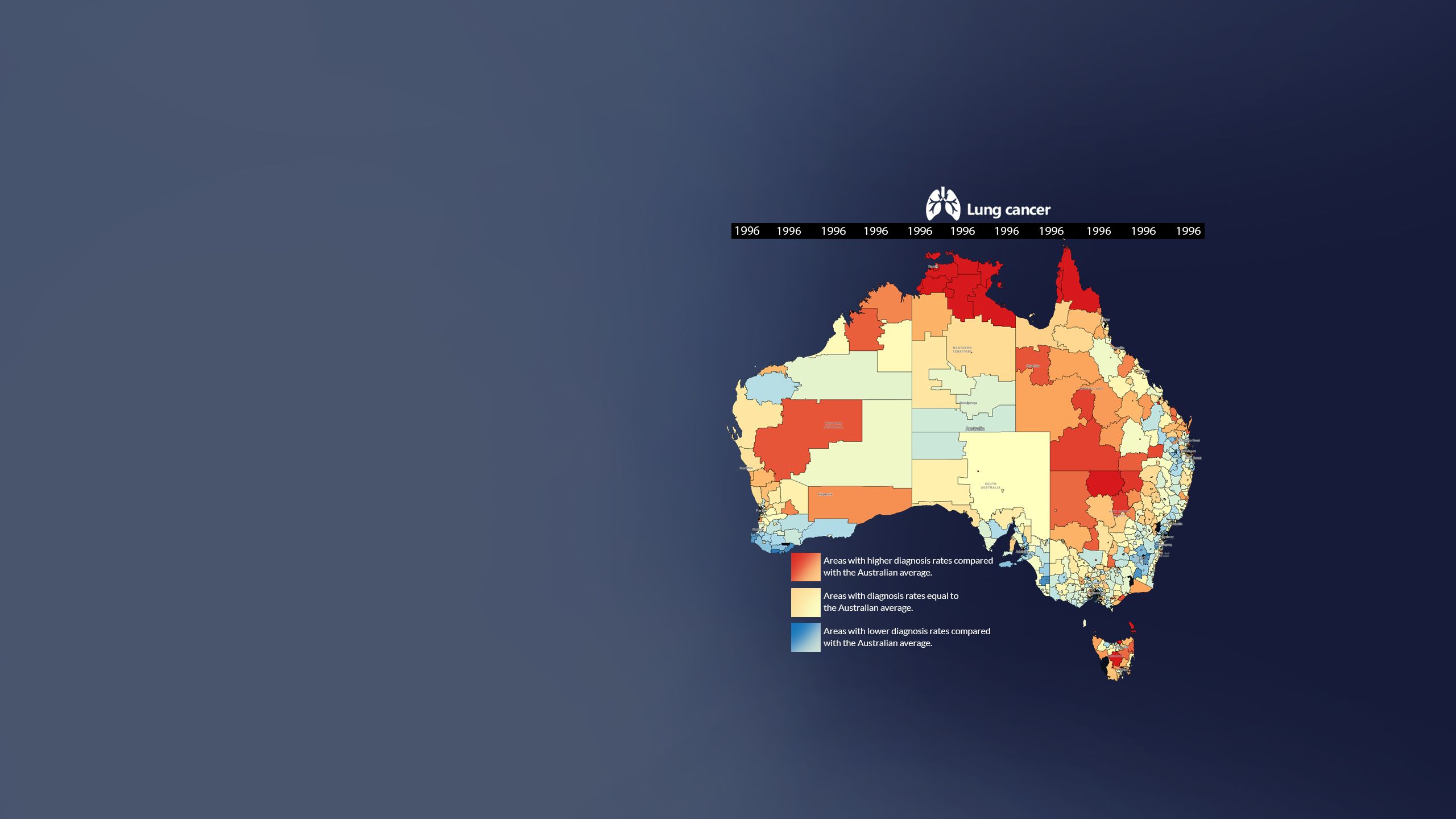 For example, the thematic map for lung cancer diagnosis in Australia in 1996 is very similar to the corresponding map (next page) for lung cancer diagnosis in 2019.